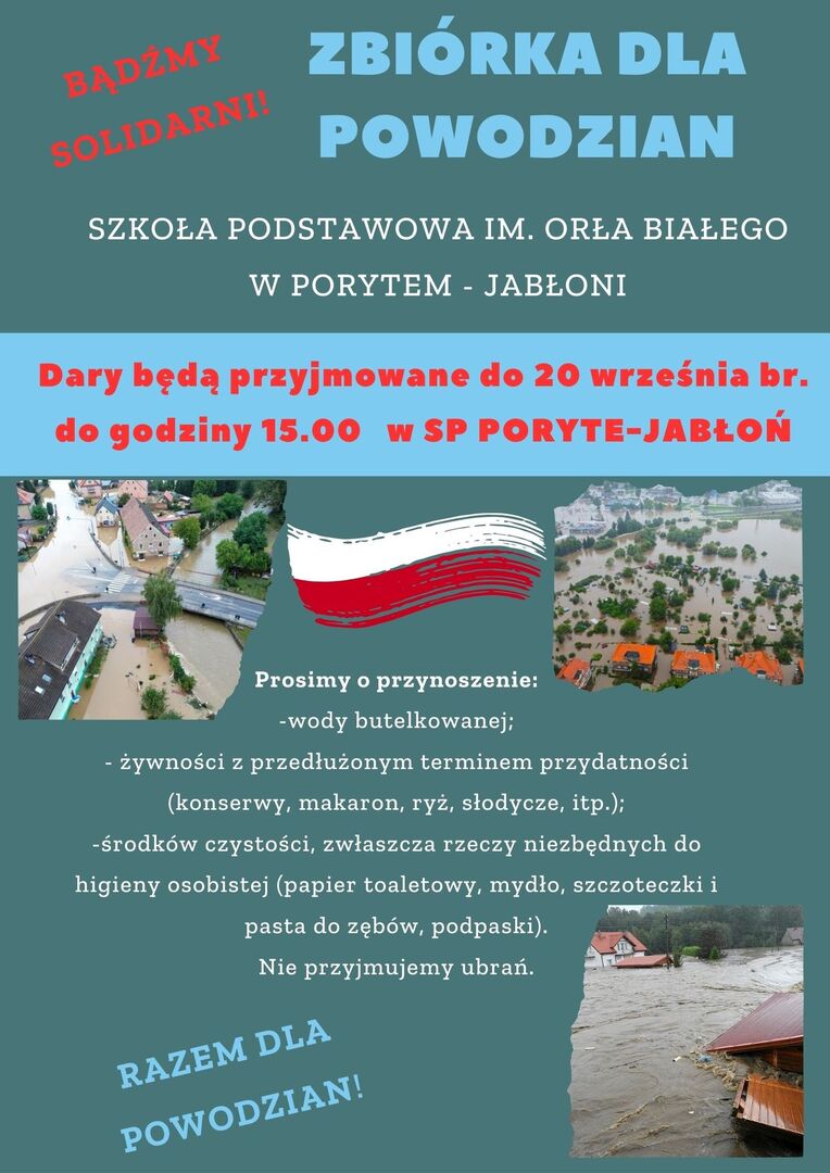 Powodzie ogarnęły południowo-zachodnią część naszego kraju. Nadal nadciągają wstrząsające informacje na temat kolejnych terenów zalanych przez szalejący żywioł. Gwałtowny wzrost poziomu wód dotknęły województwa: dolnośląskie, opolskie i śląskie.Odpowiadając na potrzeby mieszkających tam ludzi, Gmina Zambrów organizuje pomoc dla powodzian. Od dzisiaj, 18 września do piątku, 20 września w godzinach od 8:00 do 15:00 w siedzibach szkól podstawowych na terenie gminy Zambrów i w Przedszkolu Samorządowym Gminy Zambrów można przynosić dary dla poszkodowanych przez powódź na południu Polski.