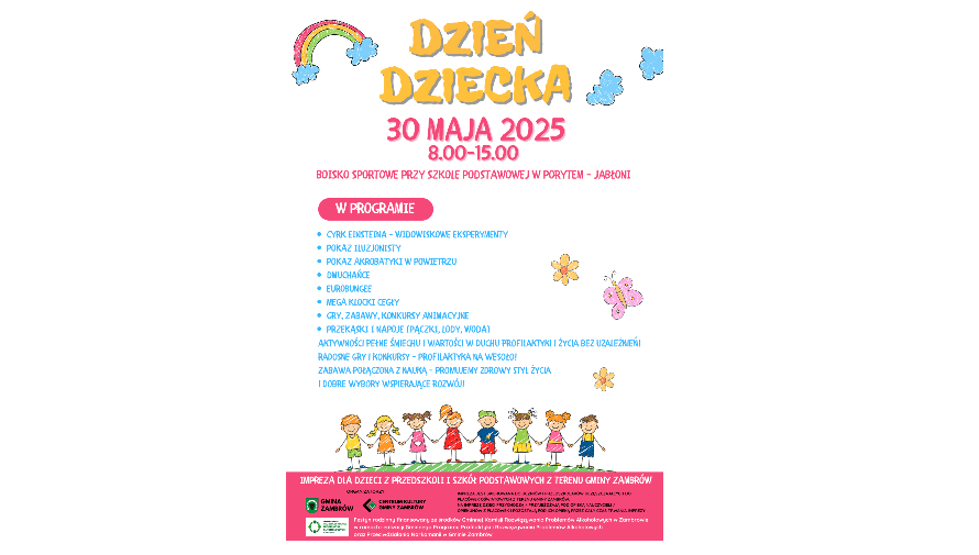 Wójt Gminy Zambrów Jarosław Kos serdecznie zaprasza wszystkie dzieci z przedszkoli i szkół podstawowych z terenu Gminy Zambrów na wyjątkowe wydarzenie – Dzień Dziecka 2025.